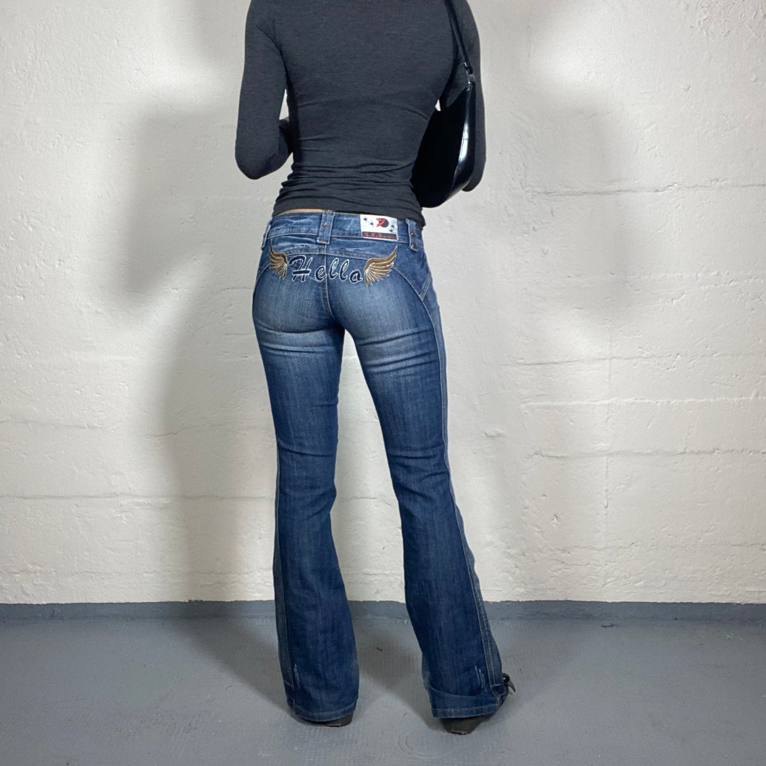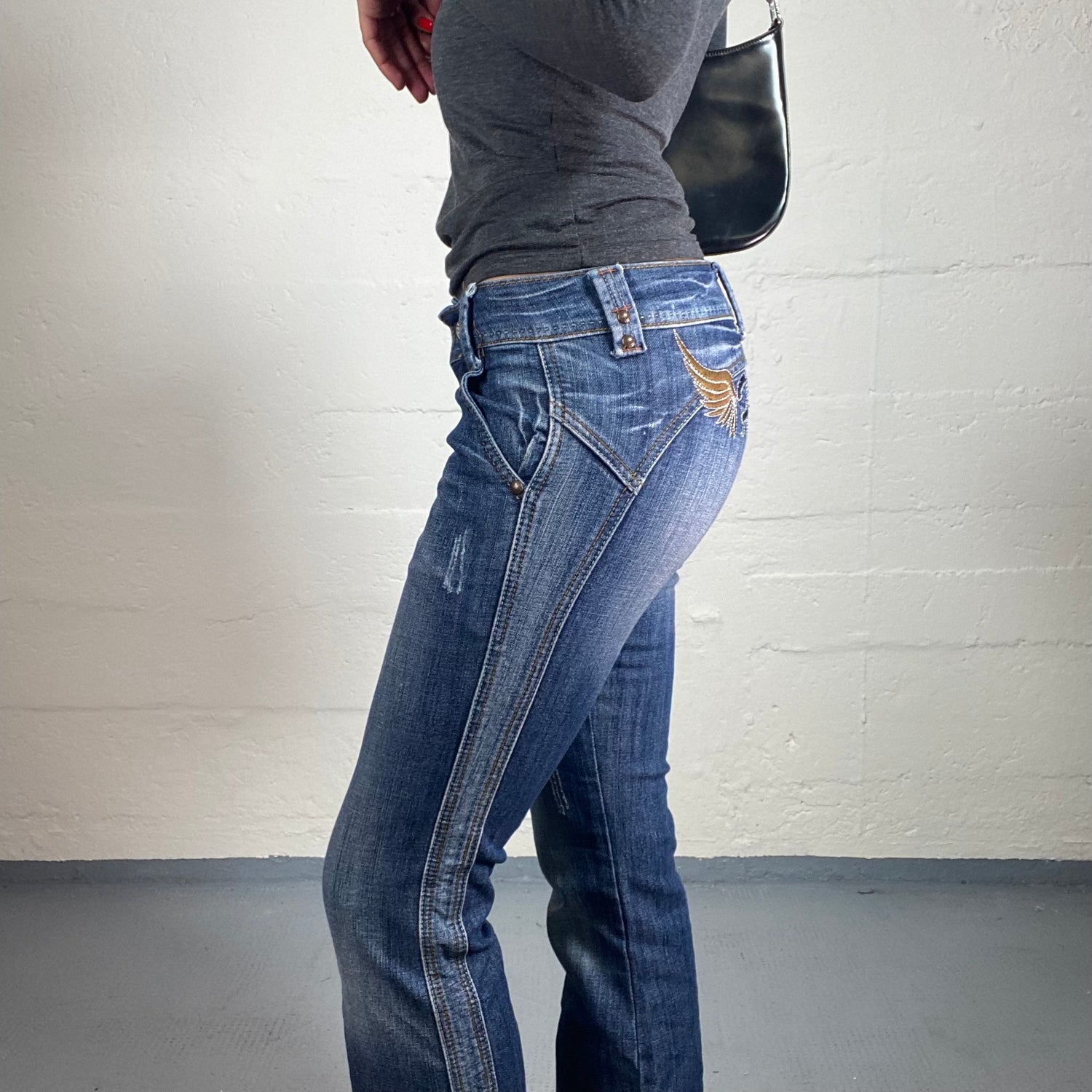 Vintage 2000's Downtown Girl Low Rise Bootcut Classic Blue Jeans with Hello Wings Back Embroidery (S)