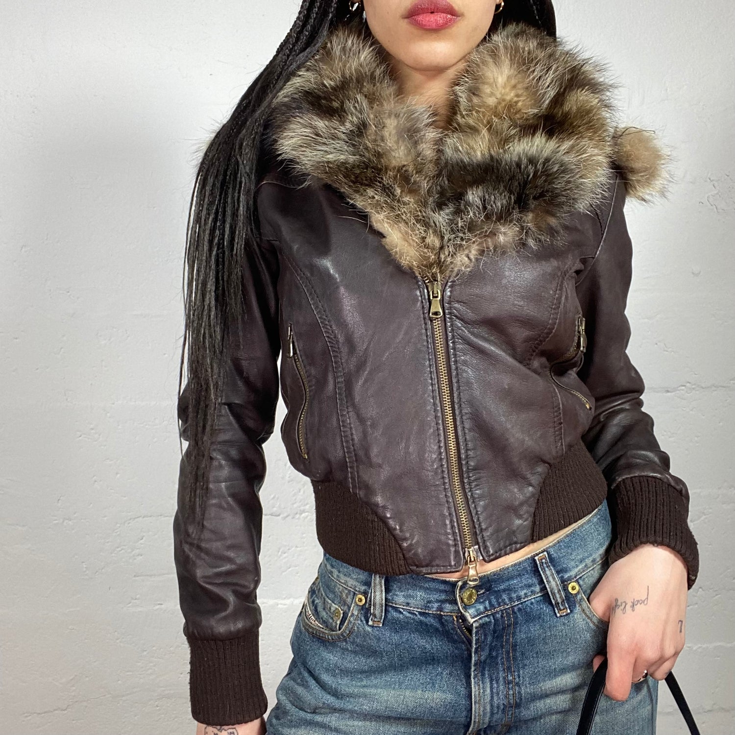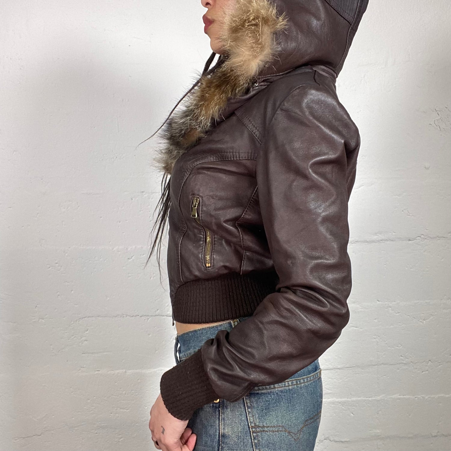 Vintage 2000’ Grunge Brown Leather Bomber Jacket with Fur Hood and Golden Zip (M)
