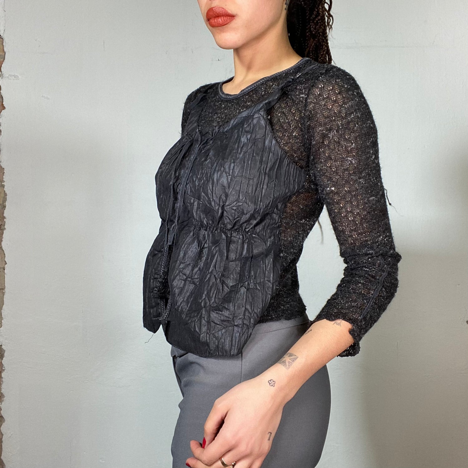 Vintage 2000's Cyber Black Knit Longsleeve with Wrinkly Blouse Attached (S)
