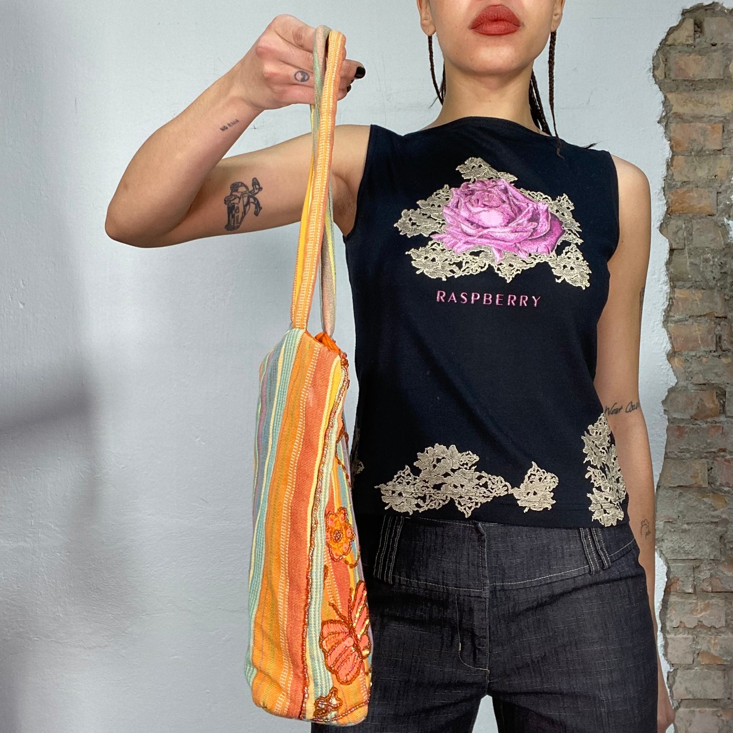Vintage 2000's Fairy Orange Striped Tote Bag with Beaded Butterfly Details