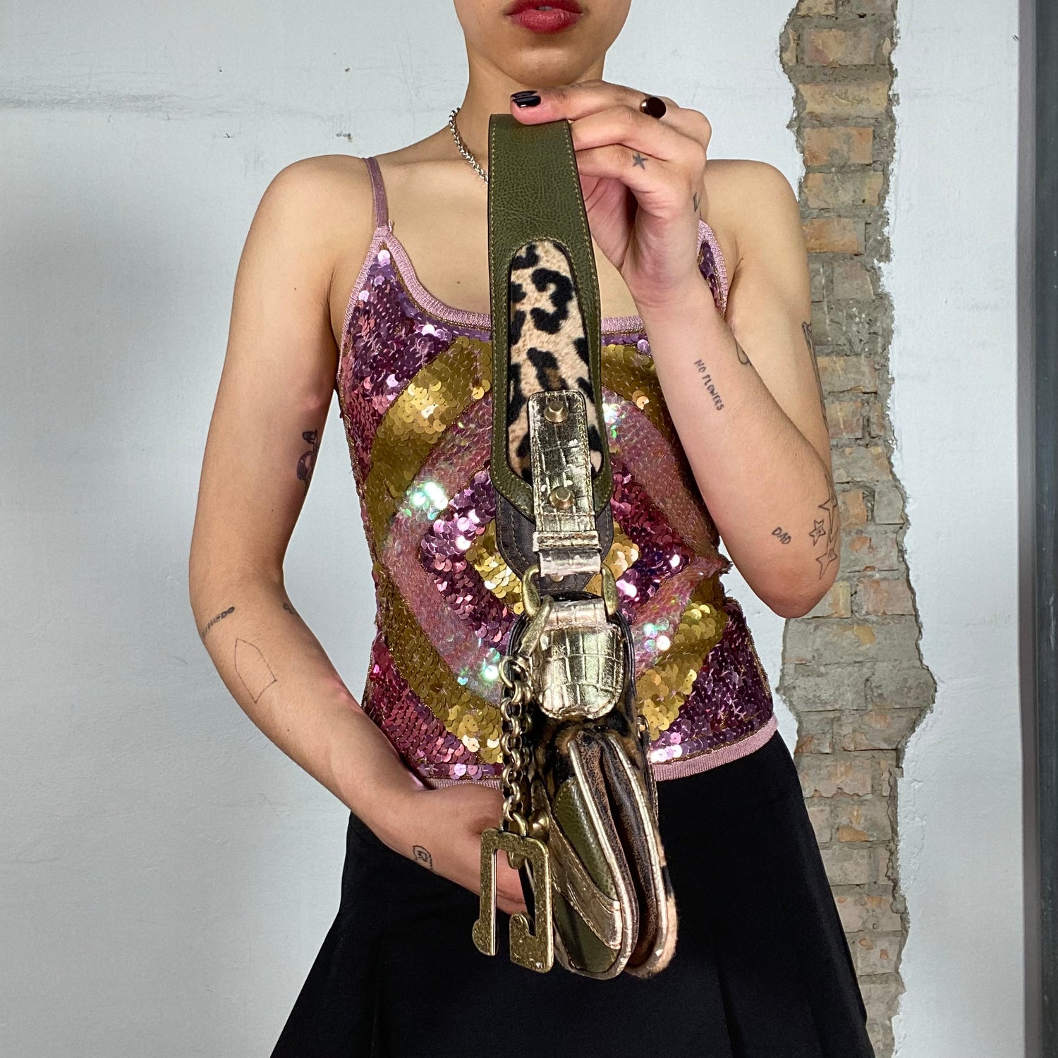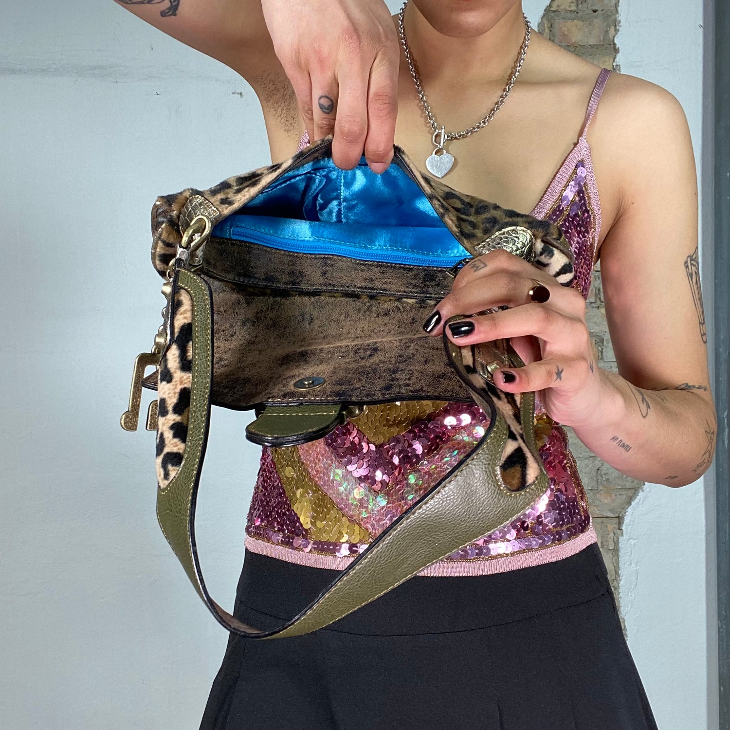 Vintage 2000's Guess Leo Print Shoulder Bag with Khaki and Gold Details