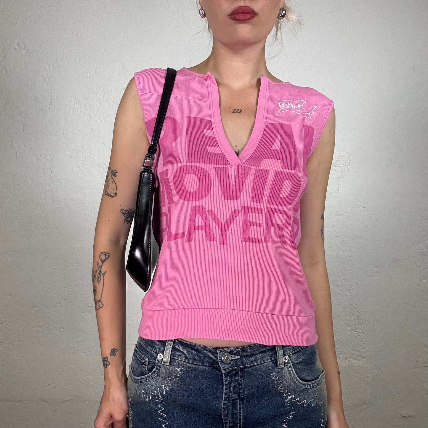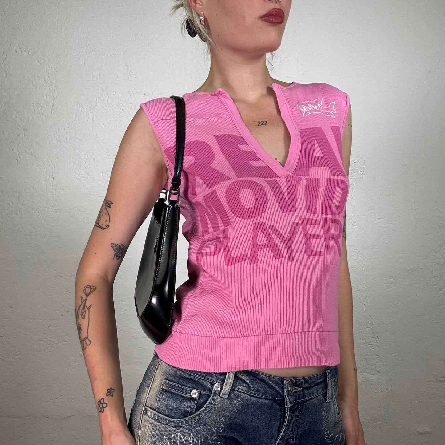 Vintage 2000's Skater Girl Pink Ribbed V-Neck Tank Top with Writing and Shark Print (S)